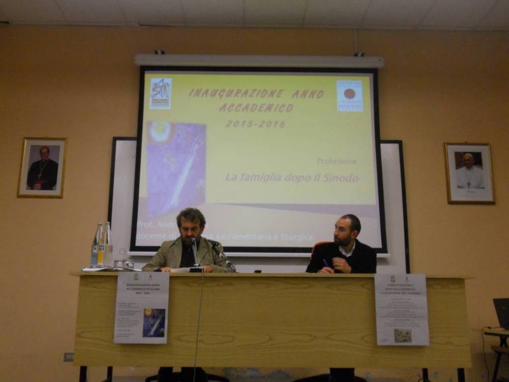 Al termine della Messa, ci siamo trasferiti nei locali del Seminario, dove, dopo la presentazione del preside dell’ISSR, don Duilio Albarello, abbiamo partecipato alla conferenza, moderata da don Marco Gallo, del professor Andrea Grillo, docente di Teologia Sacramentaria e Liturgica al Sant’Anselmo di Roma e a Santa Giustina a Padova. Il professore, dottore in giurisprudenza, filosofia e teologia, ci ha aggiornato su alcuni risvolti del recente Sinodo delle famiglie. Grillo, formulando la riflessione sulle famiglie, osserva come esse vivano anche di eccezioni. Il professore, con una certa convivialità , ha proposto anche alcune sue riflessioni personali e non poco originali, proponendo di rileggere Eucarestia e Penitenza non in chiave prevalentemente giuridica, ma soprattutto sacramentale.